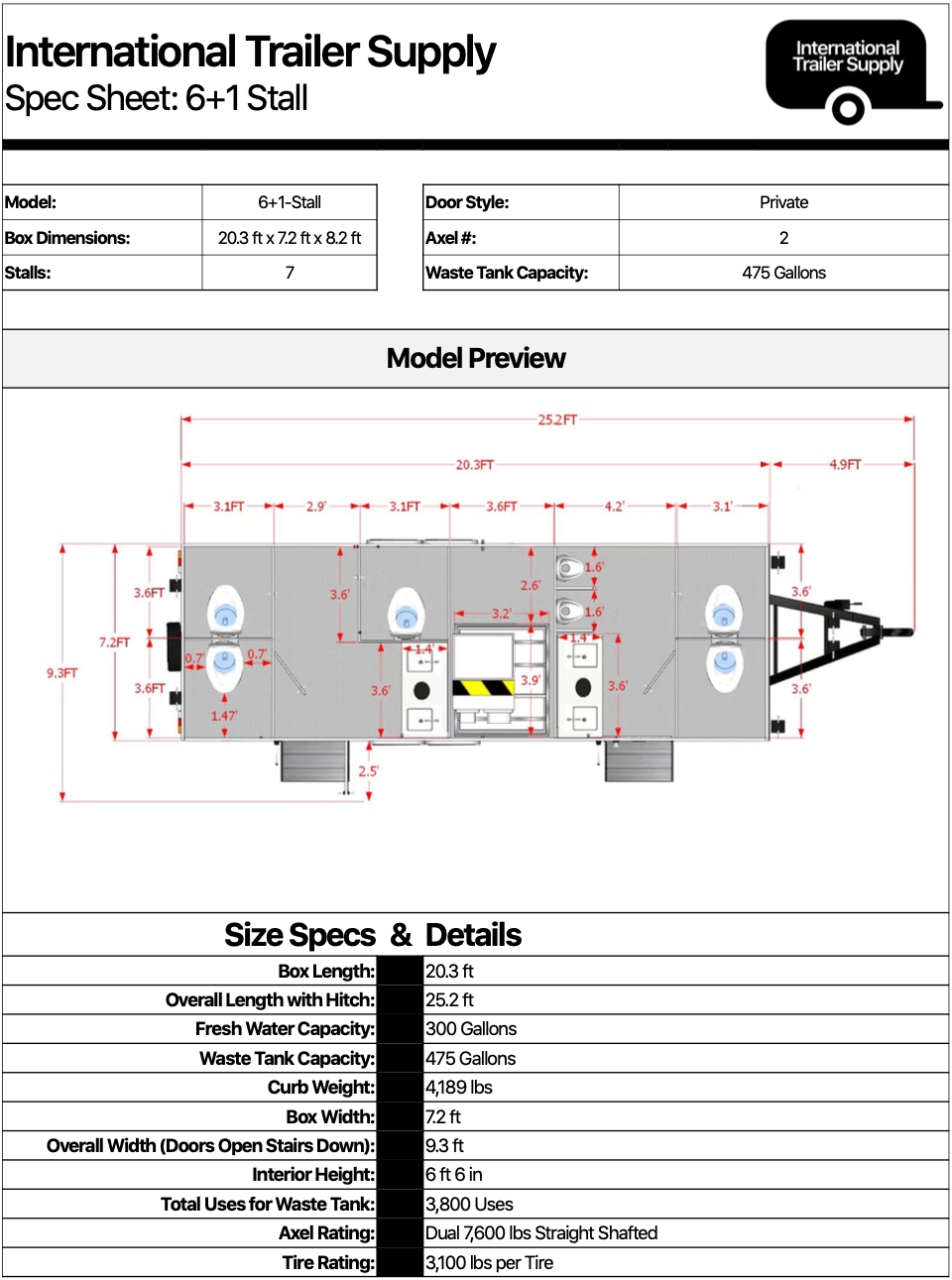 6+1 Stall Restroom Trailer - 2 Door